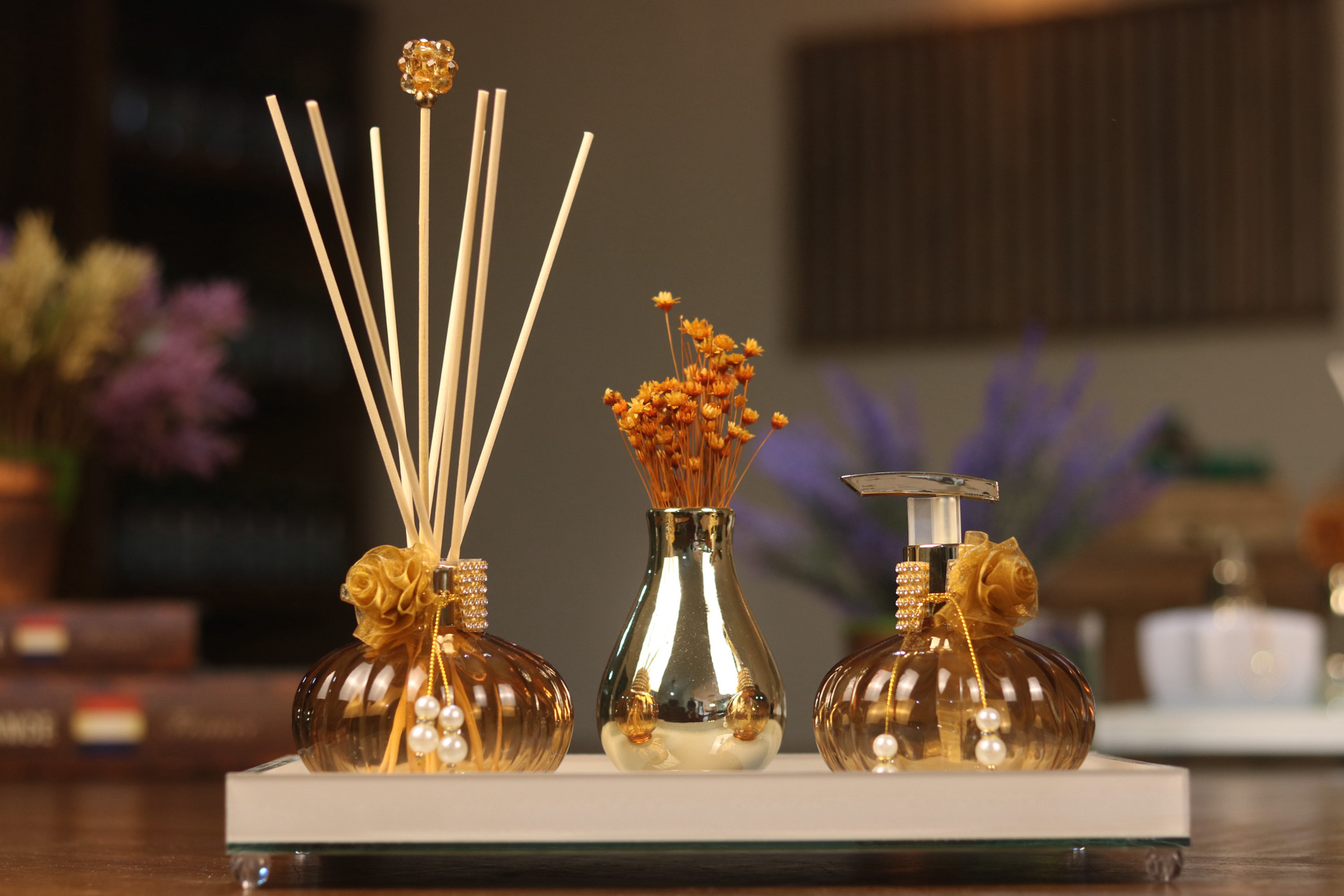 Bandeja e acessórios com detalhes que realçam a beleza de qualquer espaço.