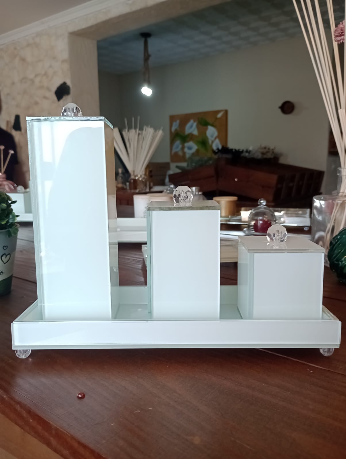 Disponível em cores neutras ou vibrantes, o trio se adapta a diversos estilos de decoração, do clássico ao moderno. É a opção perfeita para presentear ou renovar o ambiente com elegância, leveza e personalidade.