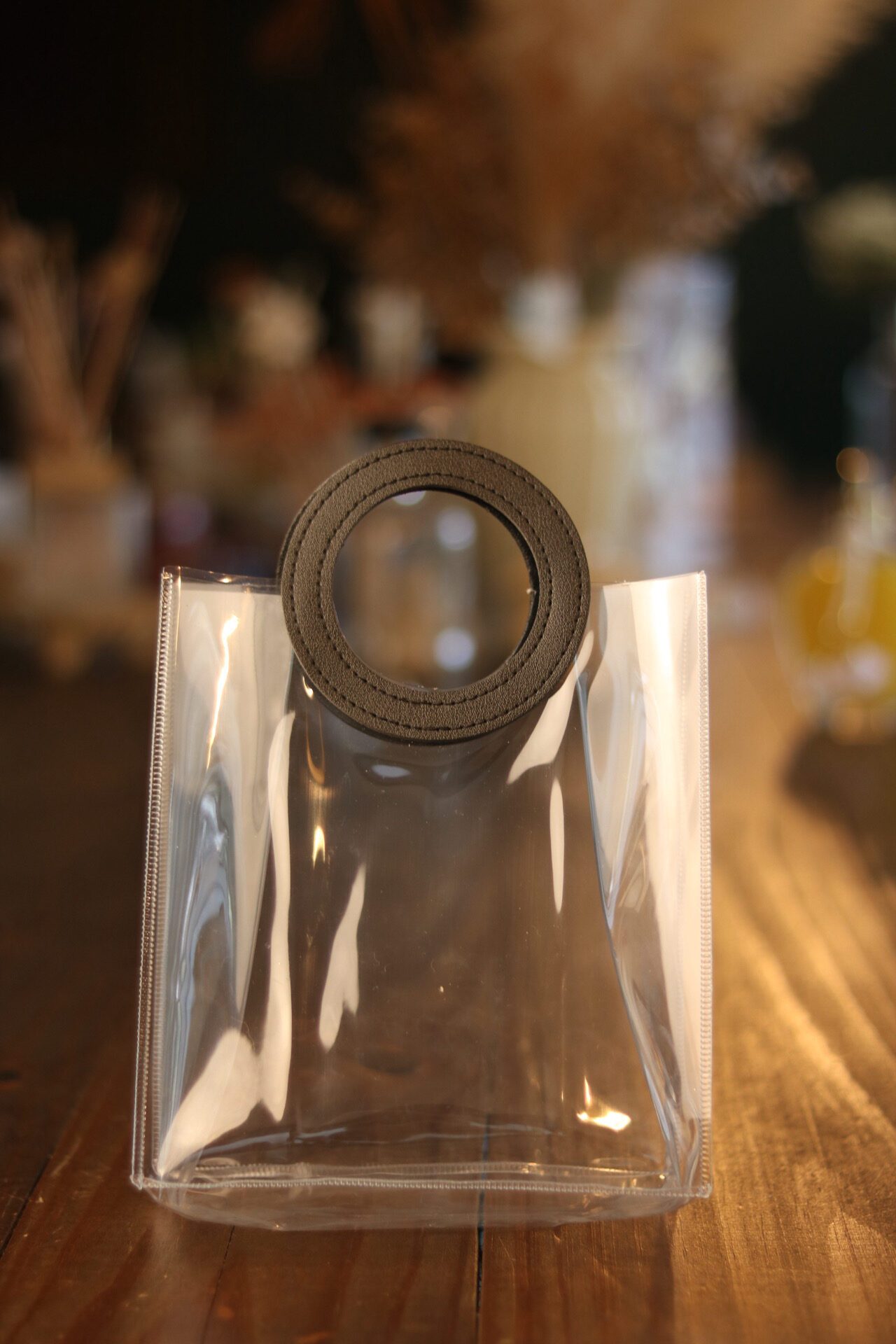 "Sacola plástica transparente com alça preta, resistente e elegante.