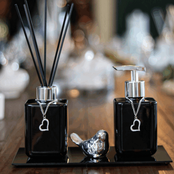 Porta-sabonete líquido e aromatizador de ambiente com design sofisticado.