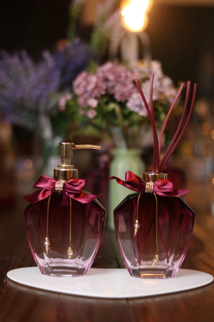 O kit é composto por dois frascos de 250ml: um com válvula pump, ideal para sabonete líquido ou home spray, e outro com varetas difusoras, perfeito para perfumar ambientes com delicadeza e estilo. Os detalhes decorativos, como o laço sofisticado e os acabamentos dourados, elevam ainda mais a percepção de valor do produto.
