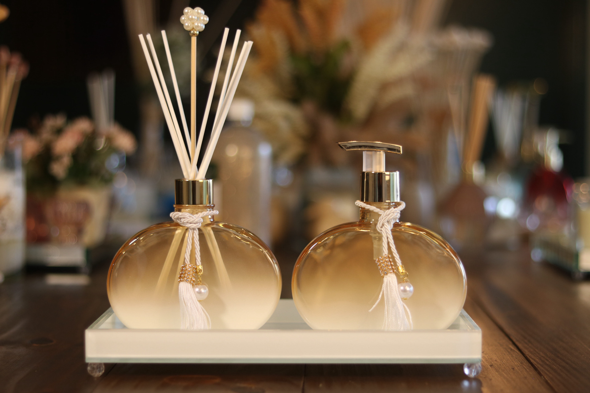 • Frascos com acabamento dourado e vidro degradê, que refletem luz e elegância