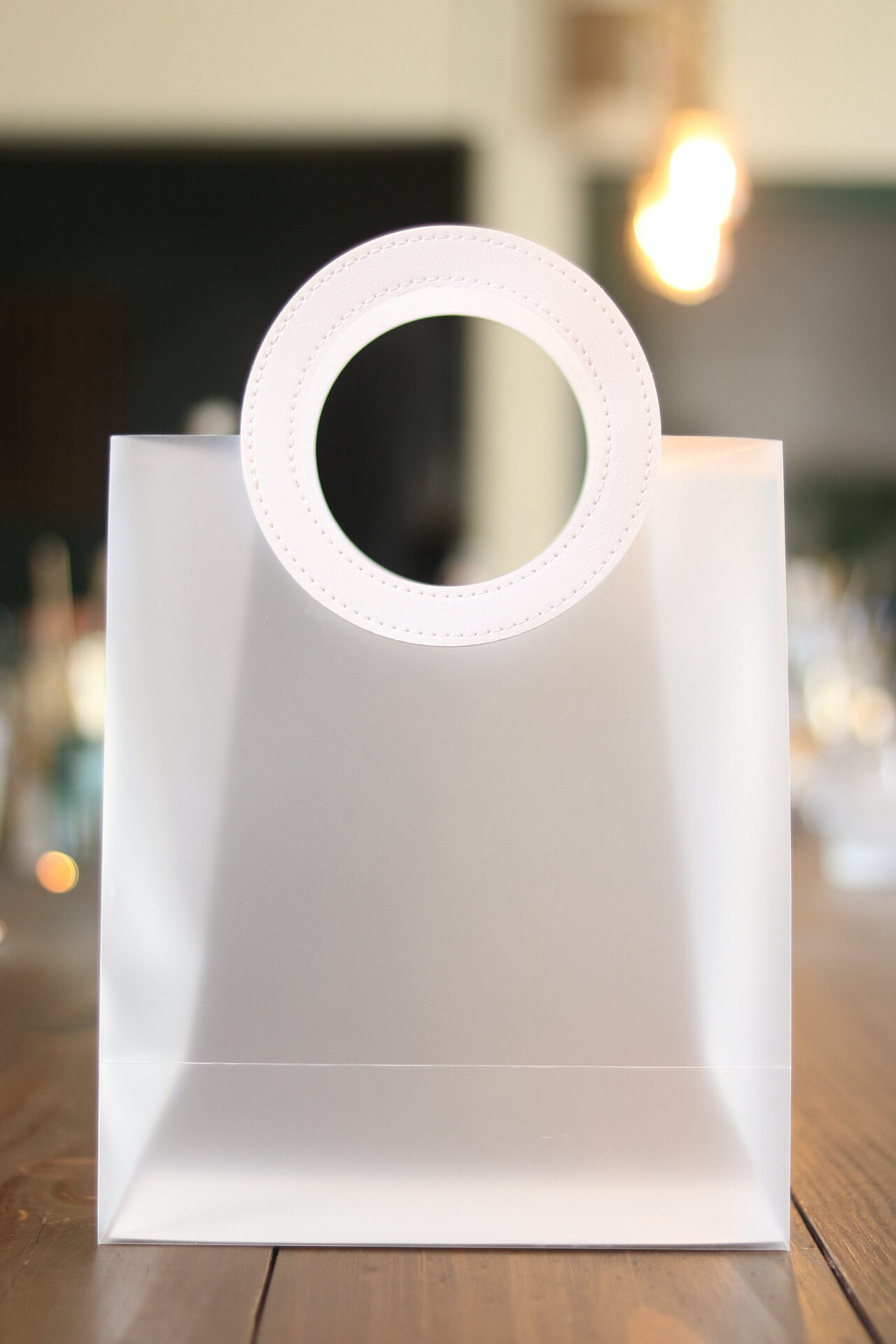“Sacola plástica transparente com alça Branca, resistente e elegante.